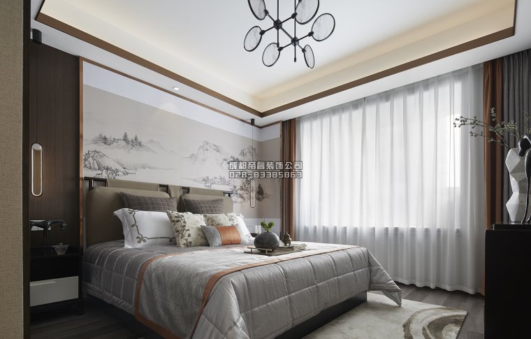 臥室背景墻使用了水墨圖紋,圓潤的印記配合矜持的色調,盡顯莊重外表下一顆沉著的心,仿佛講述著一歲一枯榮的久遠古老傳說。房間內流暢舒適的線條和靈活的多功能收納區域,似乎靜悄悄的流露出一絲絲溫暖。